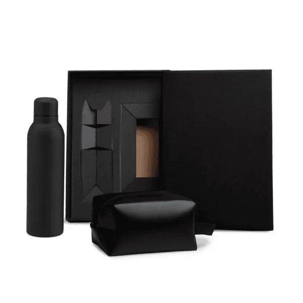 Composto por garrafa preta, confeccionada com dupla parede em Inox e necessaire com alça em material sintético na cor preta.