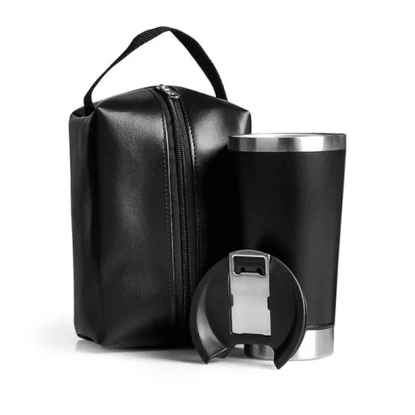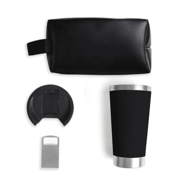 Kit necessaire e copo térmico. Composto por necessaire com alça em material sintético na cor preta e copo térmico com tampa e abridor de garrafa, confeccionado com dupla parede de inox, isolada a vácuo.