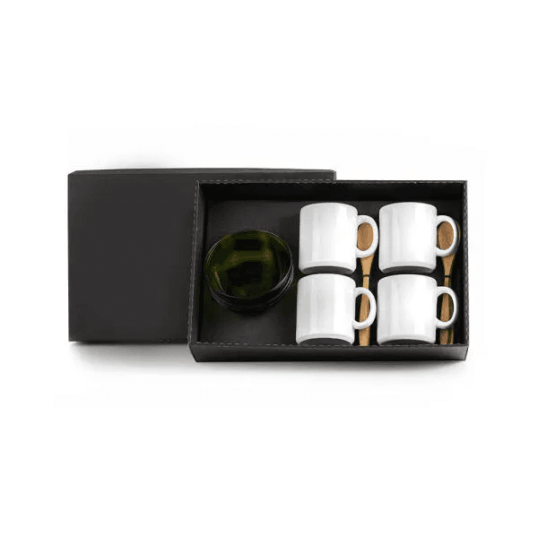 Kit matinal. Conta com quatro canecas em cerâmica; quatro tigelas em vidro e quatro colheres em bambu.