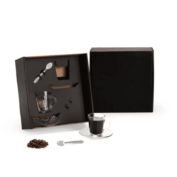 Composto por duas xícaras express americano com pires em vidro e duas colheres em Inox.