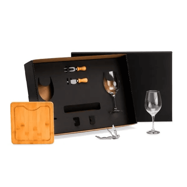 Composto por tábua em Bambu quadrada; faca e garfo em Madeira/Inox; duas taças em vidro para Vinho e abridor saca-rolhas em aço Inox escovado.