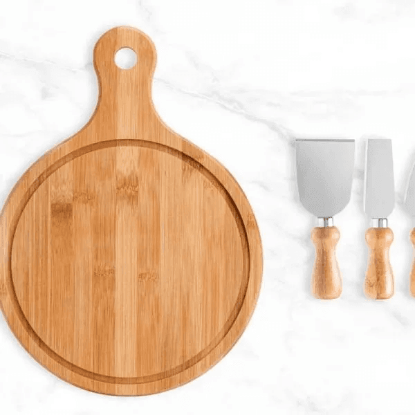 Conta com tábua com alça para queijo/petisco; Duas facas, sendo, uma com ponta e outra reta, garfo e espátula em madeira/inox; Estão perfeitamente acomodados em uma caixa para presentear.
