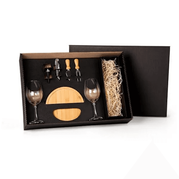 Kit para Queijo e Vinho. Conta com tábua para Queijo/Petiscos em Bambu; duas facas, sendo uma com ponta e outra reta, garfo e espátula em Madeira/Inox; duas taças para vinho em vidro; abridor e tampão em Metal; espaço para garrafa com palha (NÃO ACOMPANHA GARRAFA). Estão perfeitamente acomodados em uma caixa para presentear.