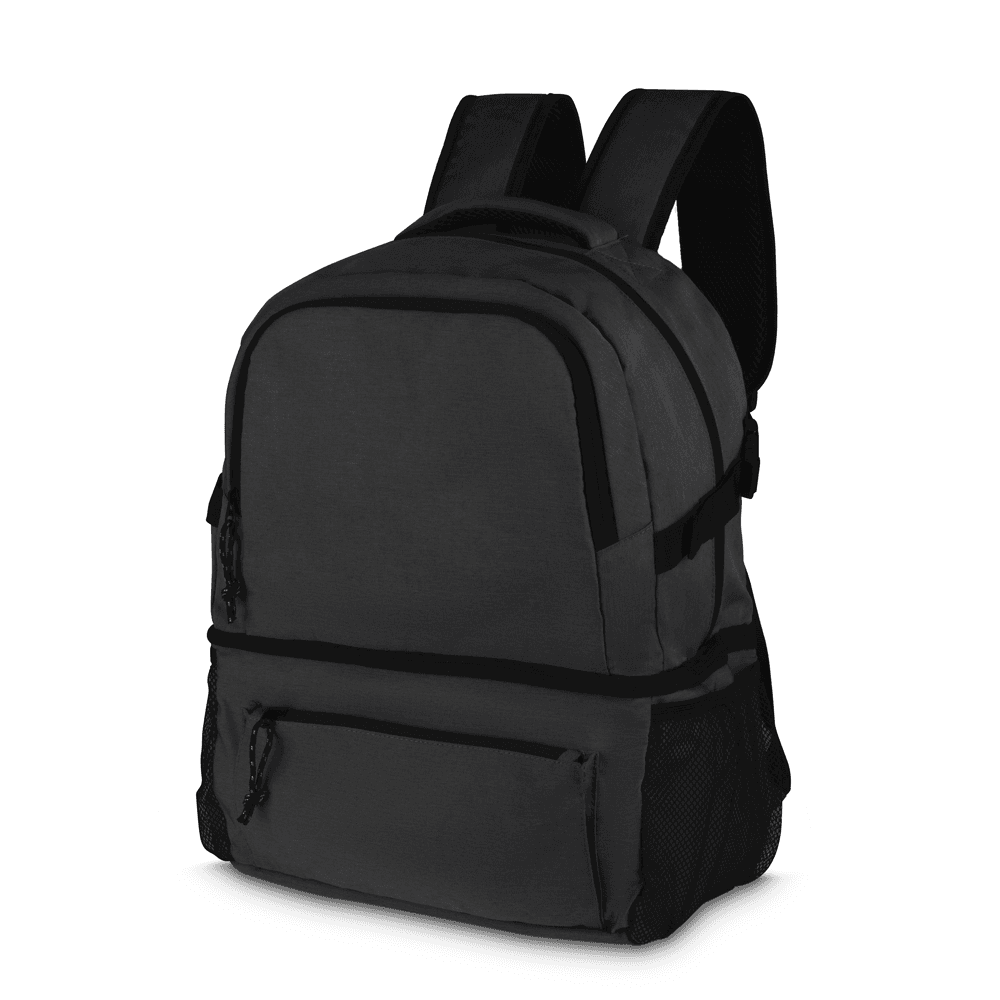 Mochila com compartimento térmico em tecido poliéster 300D e interior em PEVA.