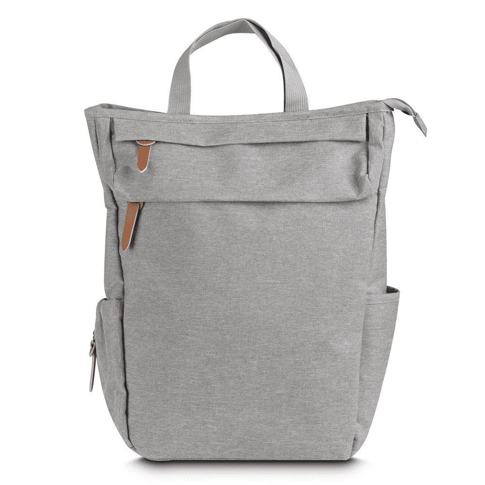 Mochila Multifuncional em poliéster 300D com detalhes em PU e interior em 210D. Possui alça de mão, alça para ombro e engate para carrinho de bebê. Conta com 2 bolsos laterais, 2 frontais com zíper e 2 compartimentos traseiros com zíper. O interior inclui divisórias, uma delas térmica, e uma divisória com zíper. Prática e versátil.