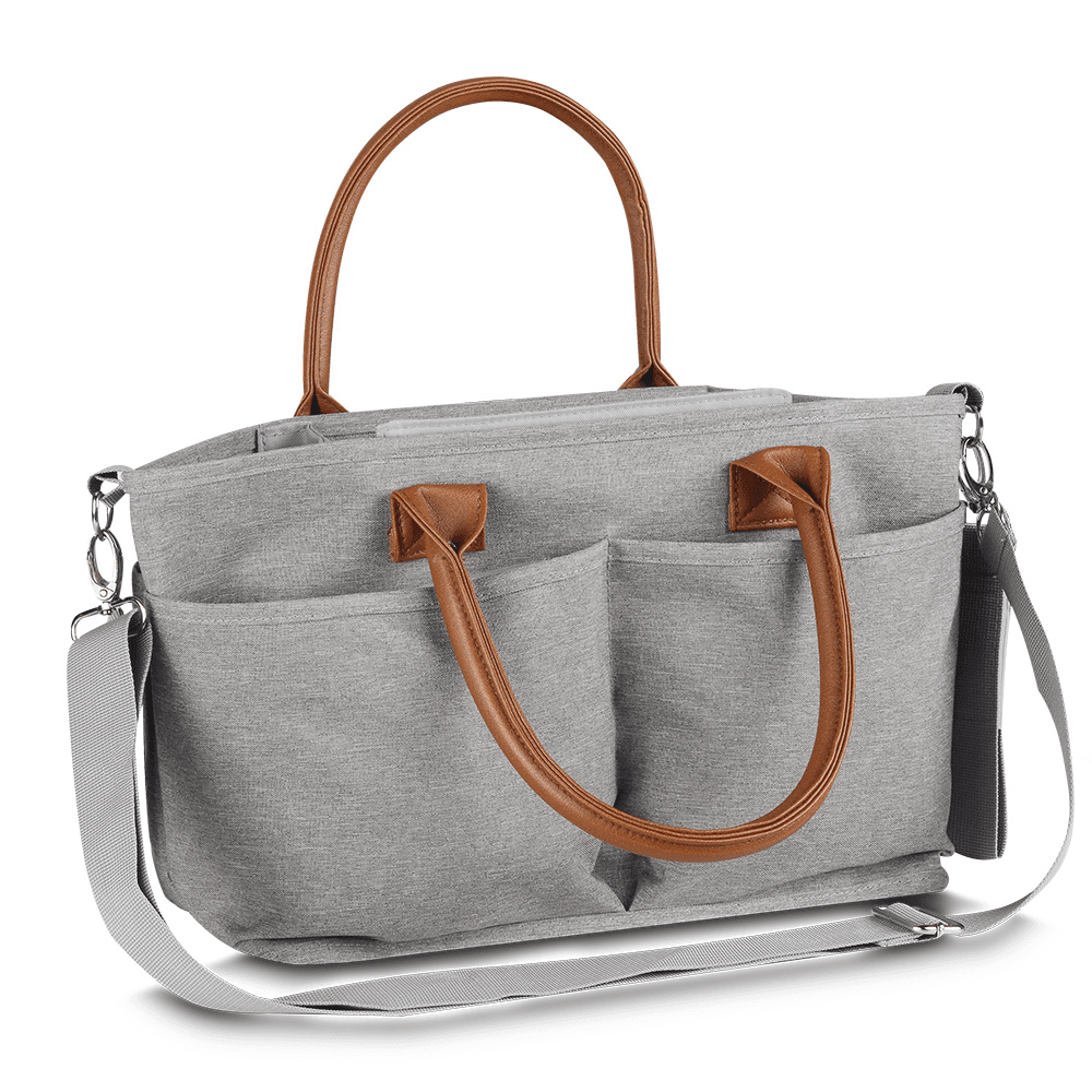 Bolsa Multifuncional em poliéster 300D com detalhes em PU e interior em 210D, possui 5 compartimentos externos. Conta com alças de ombro e mão em PU, engate para carrinho de bebê e velcro para fechamento interno. O interior oferece 5 divisórias removíveis, sendo uma com zíper e uma com tecido térmico, proporcionando praticidade e organização.
