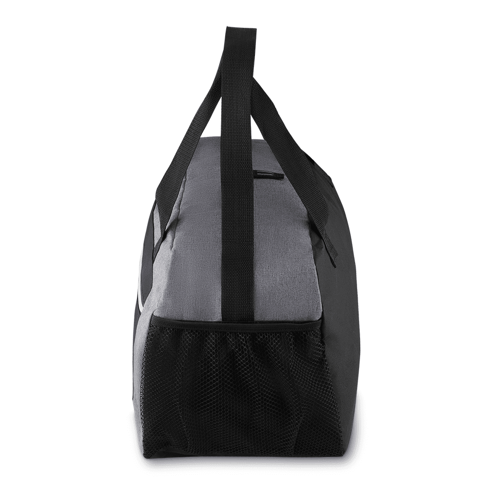 Mala esportiva em poliéster 600D e 300D, zíper frontal, bolsos laterais, alça de mão e ombro.