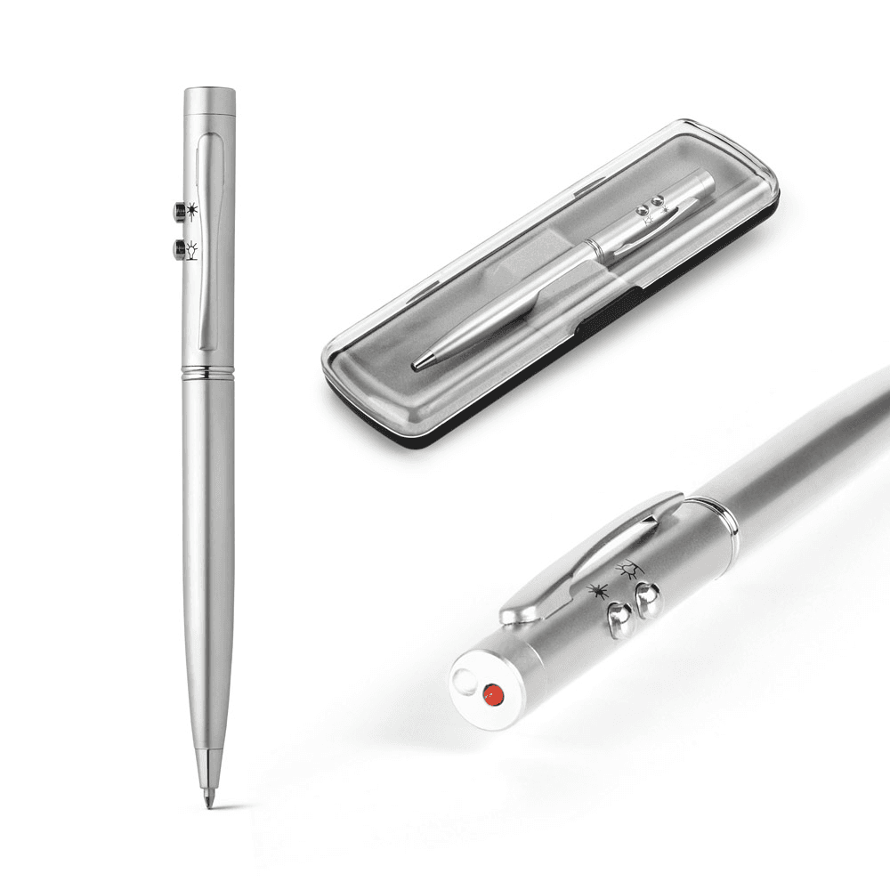 91821 EBRE. Esferográfica em metal com ponteira laser, LED e escrita em azul